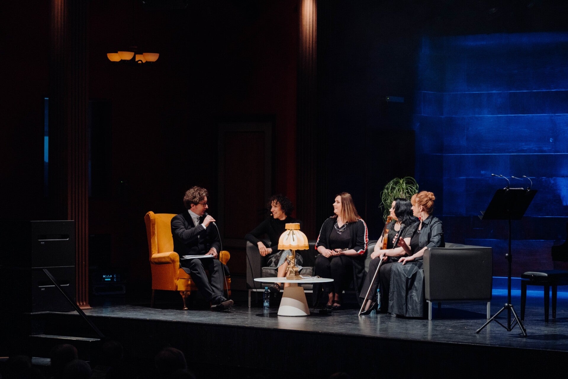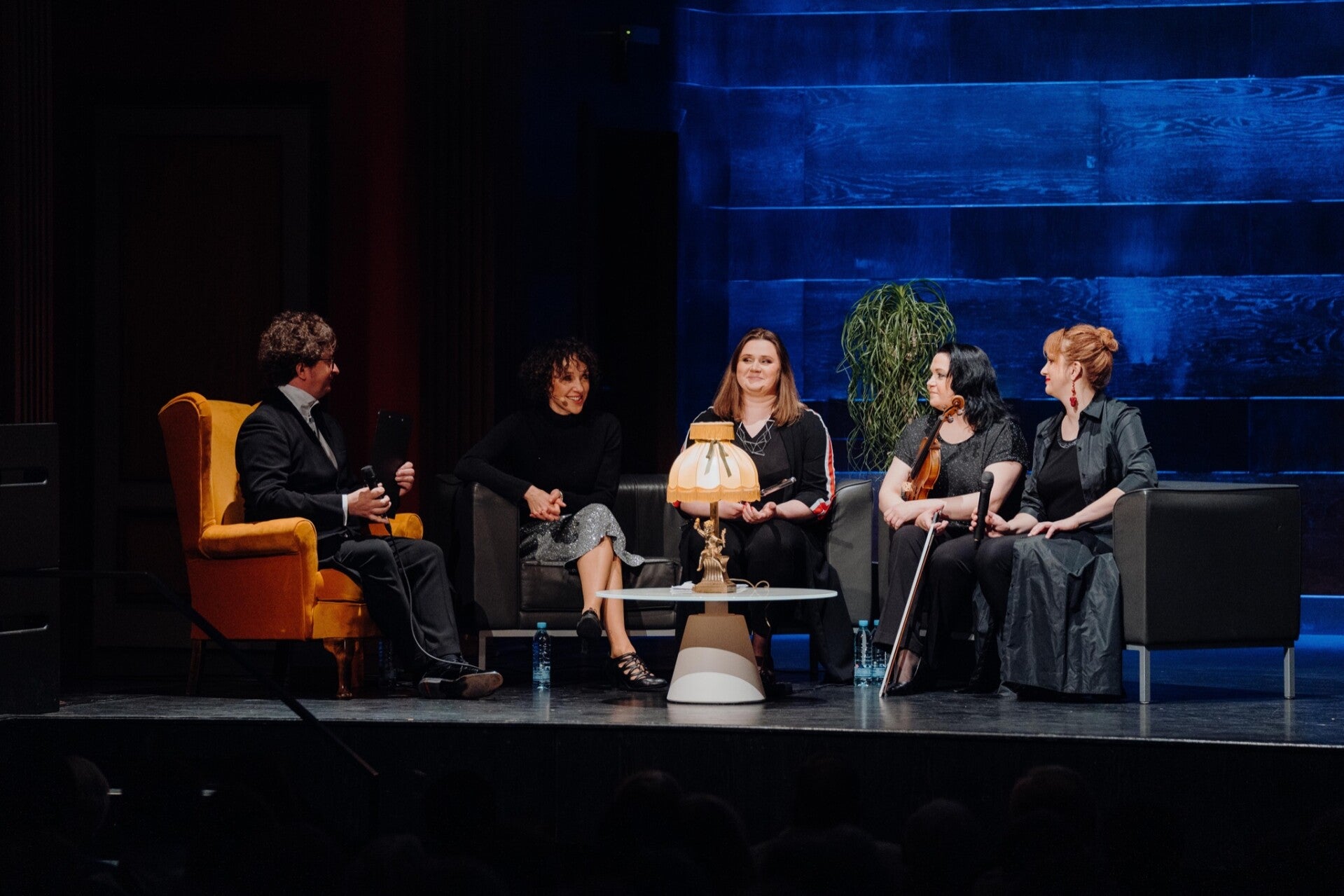 Dzintari Concert Hall, Jurmala, Latvia. May 8, 2022. NYX TRIO and actor Karina Tatarinova. Photos by Pauls Zvirbulis